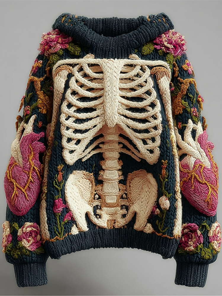 Halloween Skeleton & Floral Embroidery Women's Knit Hooded Sweater