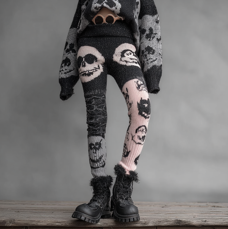 Halloween Skeleton Funny Pumpkin Pattern Knitted Tight Wool Pants