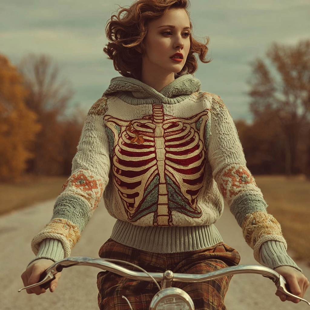 Vintage Halloween Skeleton Art Knit Cozy Hooded Sweater