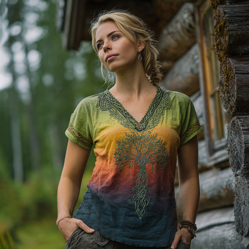 Vintage Viking Life Of Tree Gradient Art Women's Linen V Neck T-shirt