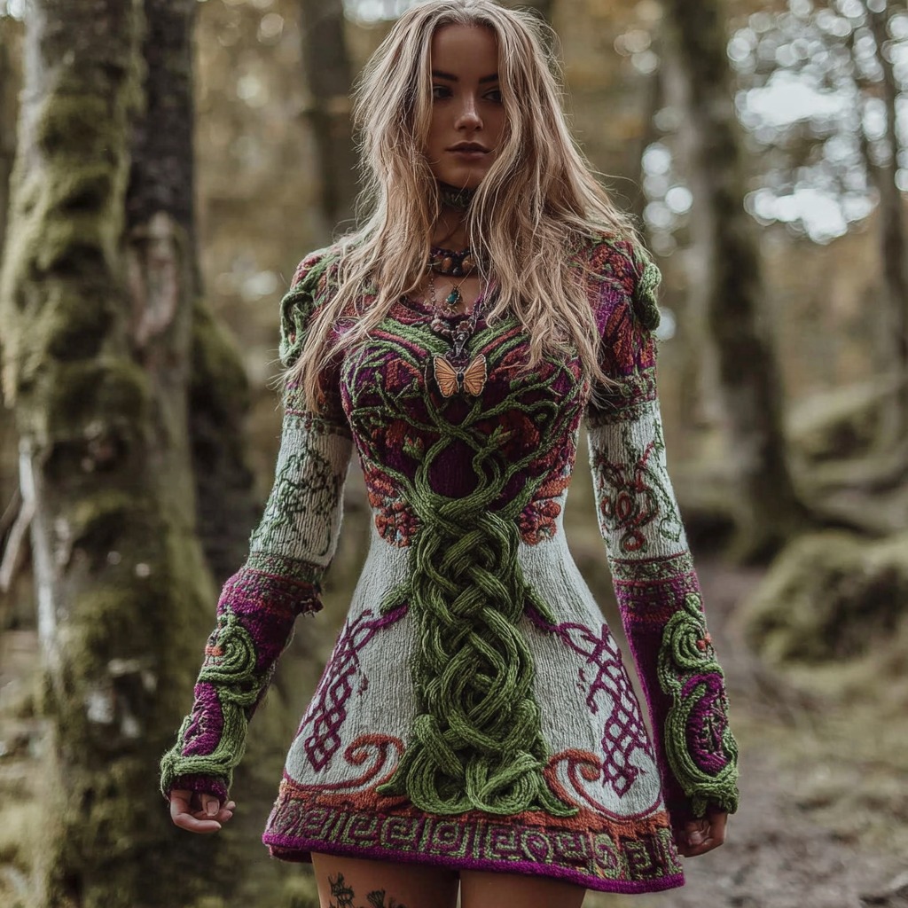 Women's Vintage Viking Celtic Knot Tree Of Life Knitted Sweater Flared Skirt